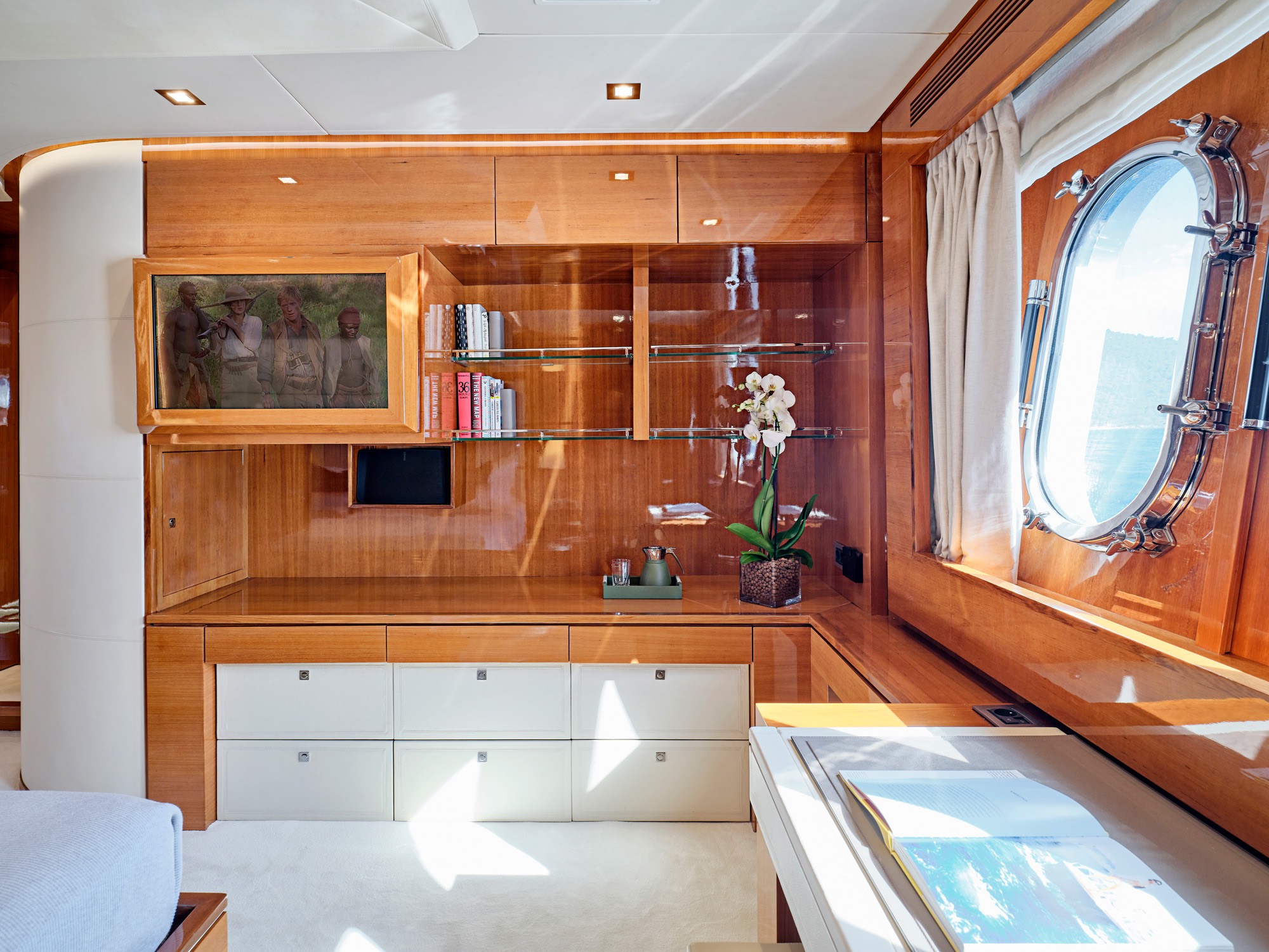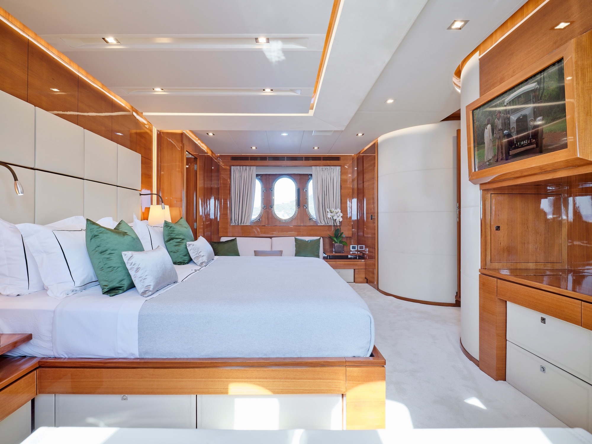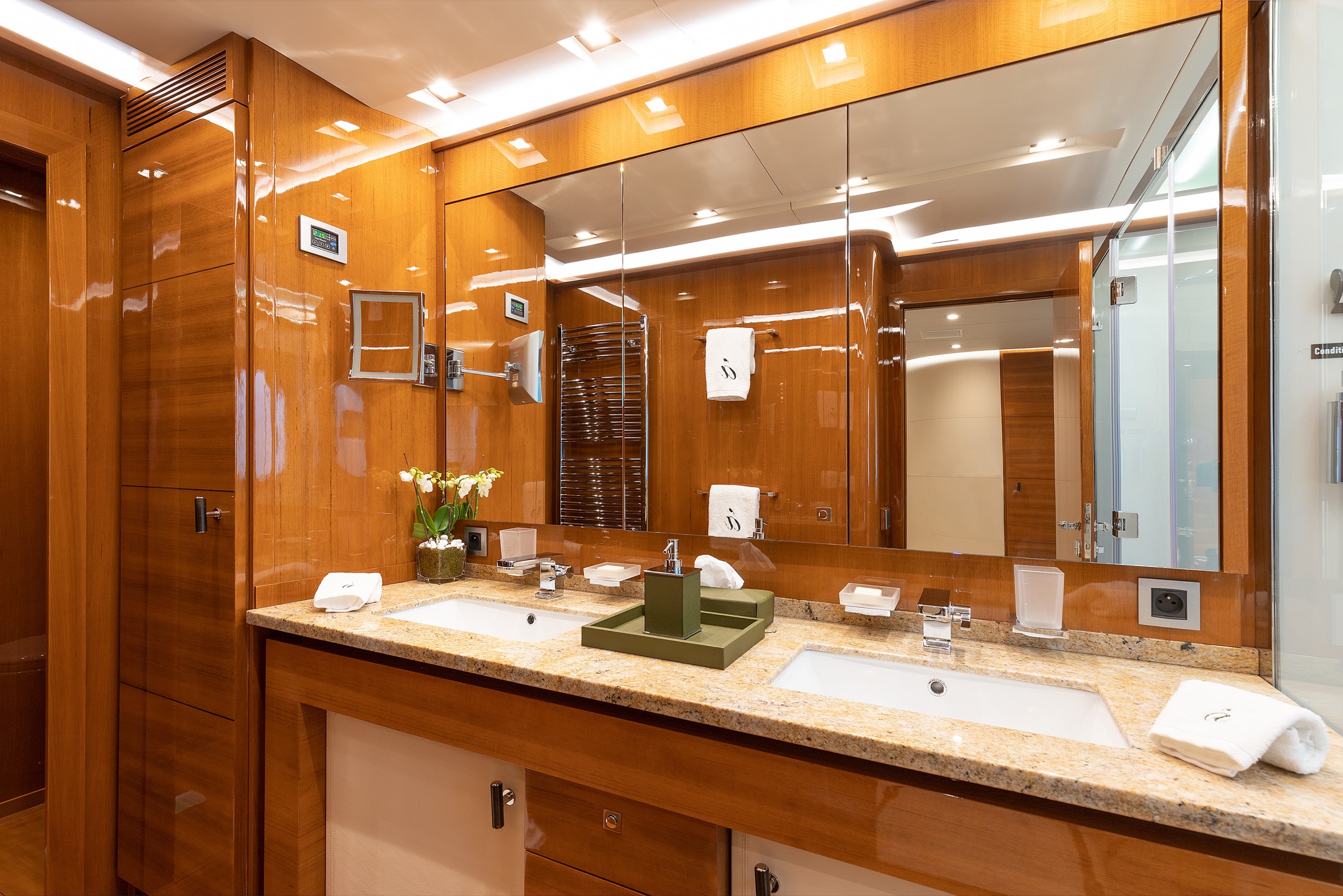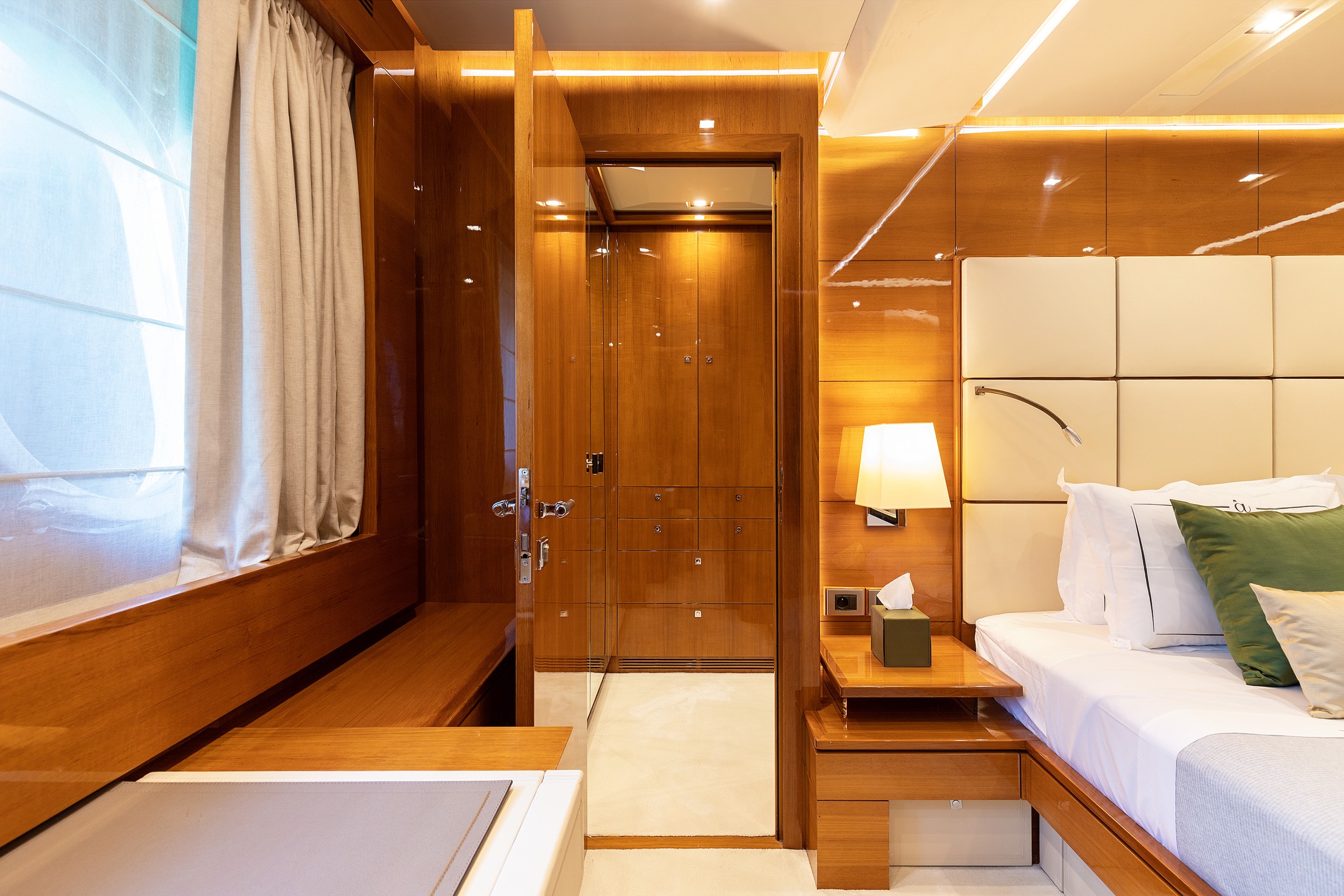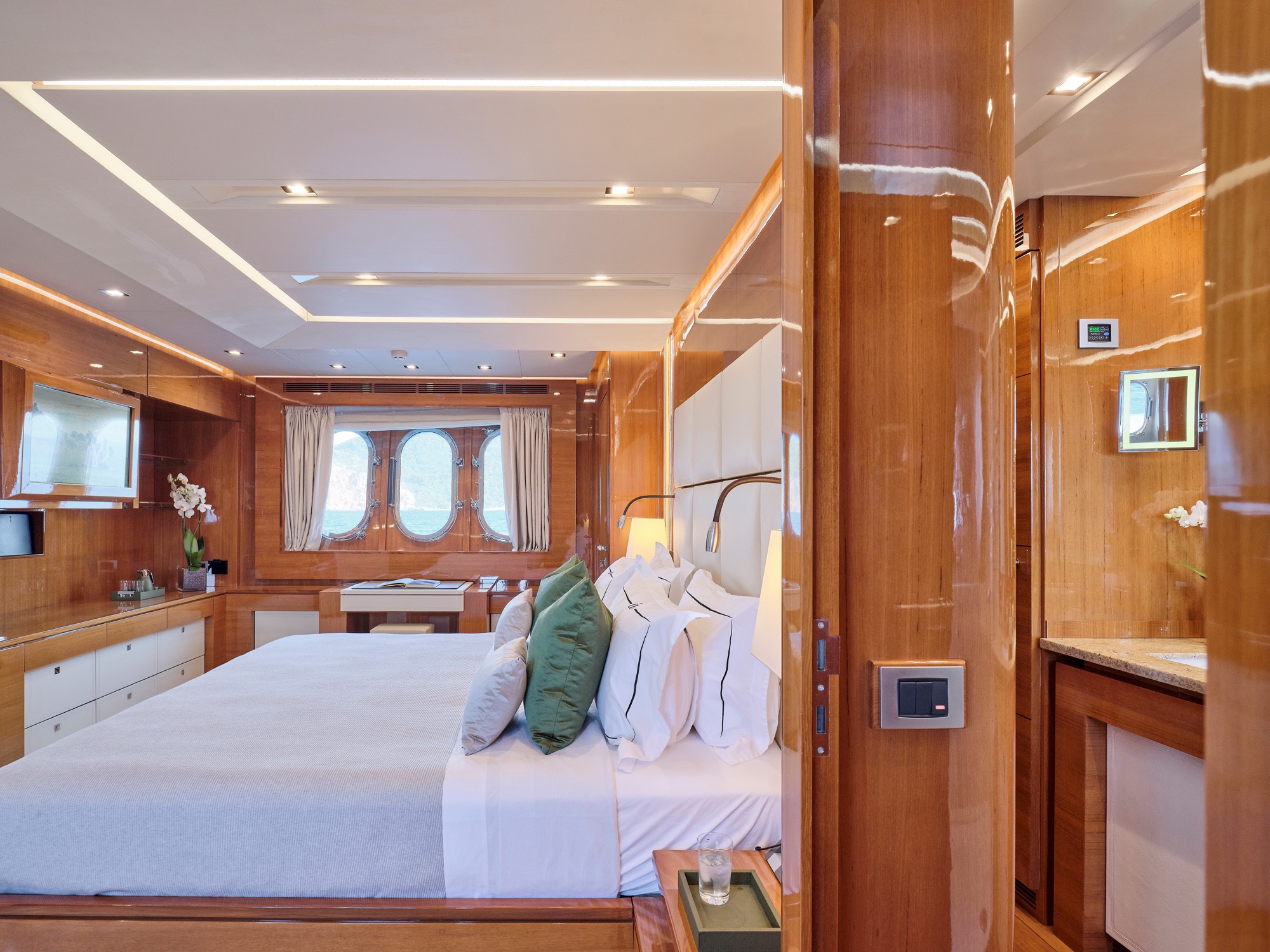 The full-beam Master Cabin is located amidship, and features a super-sized king bed, a sofa, a writing desk, and a walk-in closet.