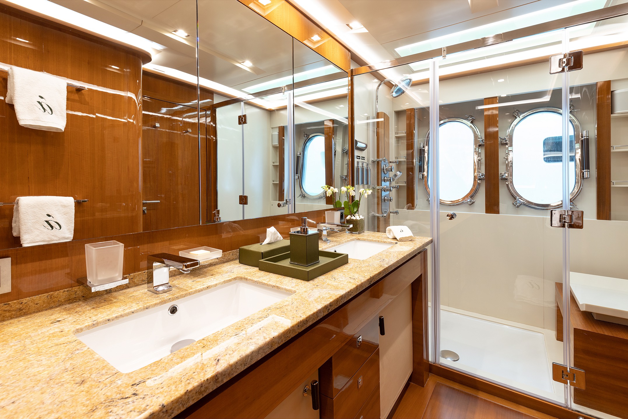 The head features a separate enclosed WC, a double wash basin, and a large rain shower, three-way shower system, featuring portholes with a view of the sea. Speakers in the shower.